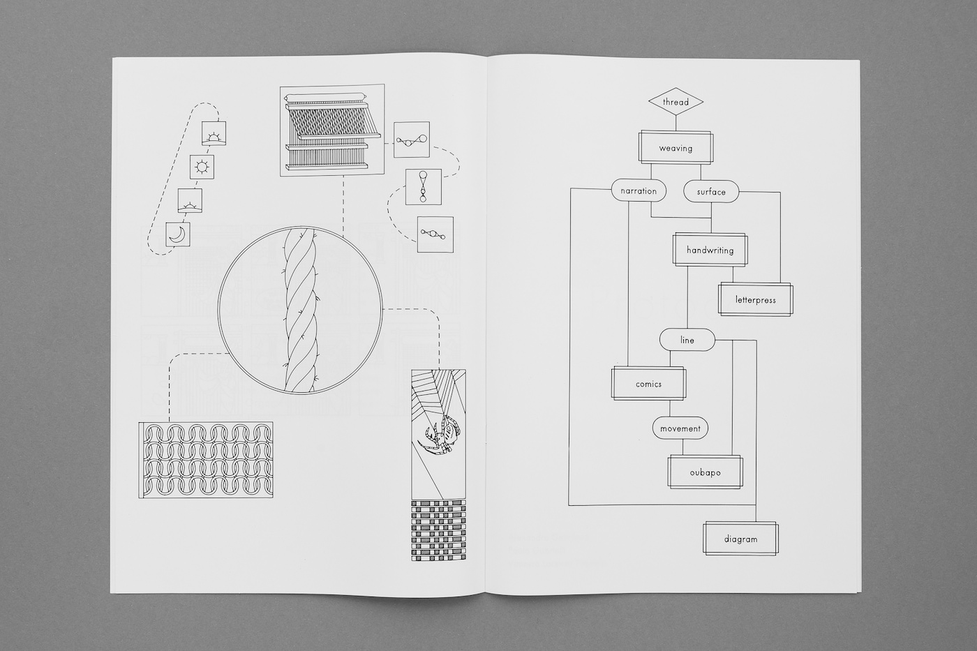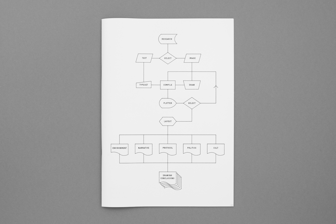 “Diagrams, maps and technical drawings were largely used to codify global envisions and to disseminate ‘images’ of the planet Earth as a whole. The ‘Drawing Conclusions’ workshop aimed to reflect upon and to trace back models that emerged in the 1950s when the mathematical theory of communication and cybernetics spread out. Students started to explore a wide range of references from the history and the theory of culture and technology. With the help of the Scriptographer software, they designed sequences of graphical representations, thus drawing conclusions on five given topics: Environment, Narrative, Protocol, Politic, Cult. The process ended up in the Drawing Conclusions books series. One contains short essays, while the other is made of pictures carefully drawn by a machine taking advantage of the inner structure of vector graphics.”