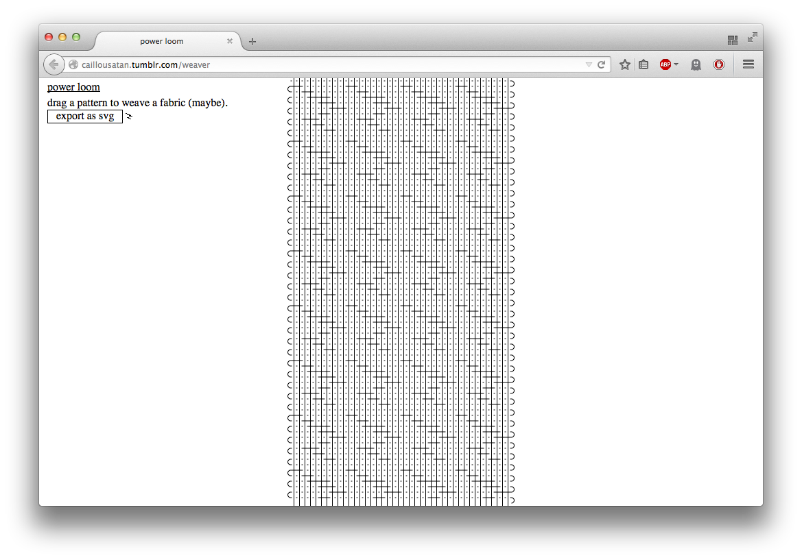 We used the first page of the loom as an opportunity to explore new tools and ways to draw. Using paper.js, a vector drawing frameworks for the web, i built an in-browser power loom that we could feed with little patterns to generate a javascript fabric. With the resulting file, the plotter would act as a weaver, first drawing the warp, before moving like a shuttle and weaving the weft across the loom.