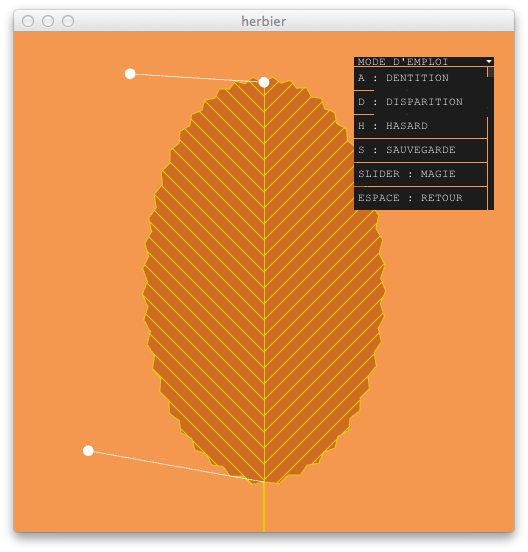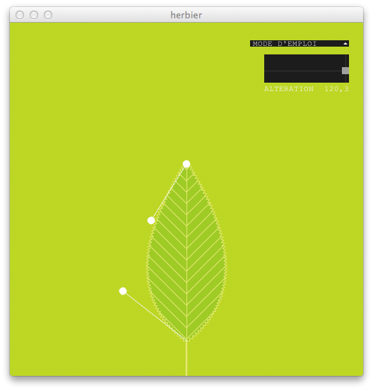 One of my first programming projects, Herbier is an application that helps creating and finding new leaves. Different parameters allow manual control over the leaf’s shape and borders, which can also be generated randomly.