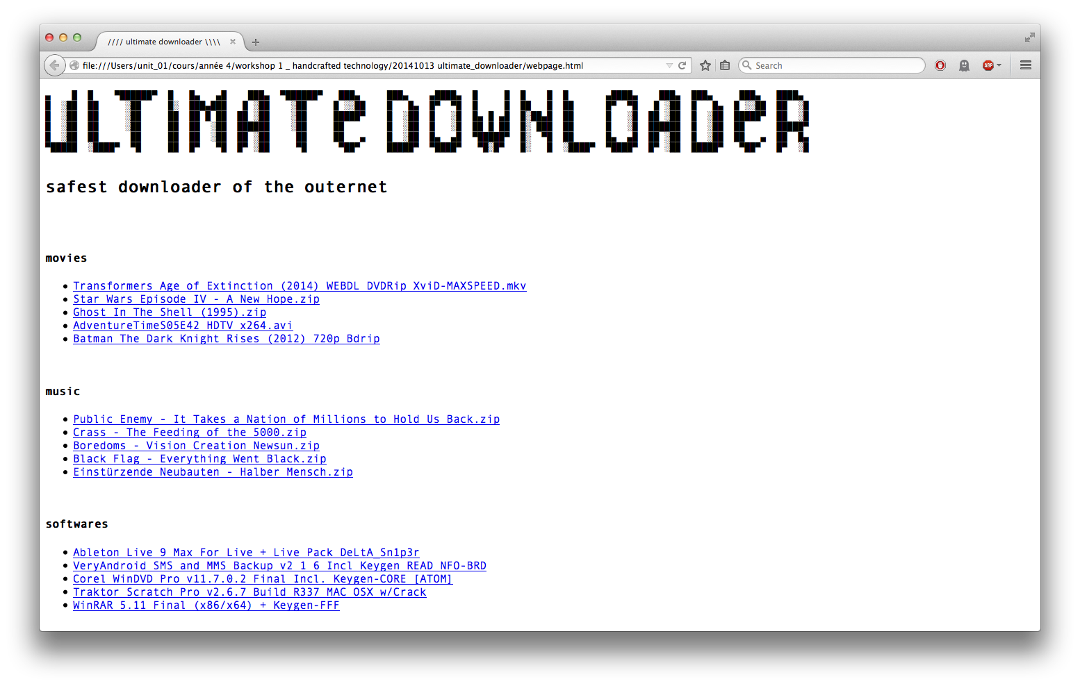 “A floating balloon fitted with a mini computer creates an open wifi hotspot to access the Internet. However all requests are directed to the same web page that allows to download illegal content. Seduced by the proposal, the user is instantly photographed and identified by the system, which then posts the picture, the reference of the hacked file, the place and time of the offence on a social media network. Appearing to be an open project, the device could have been commissioned by a major entertainment corporation or an anti-download lobby.”